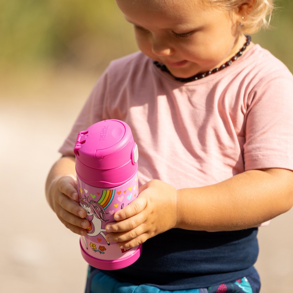 - Ve víčku je výklopné poutko, za které dítě snadno termosku nese.