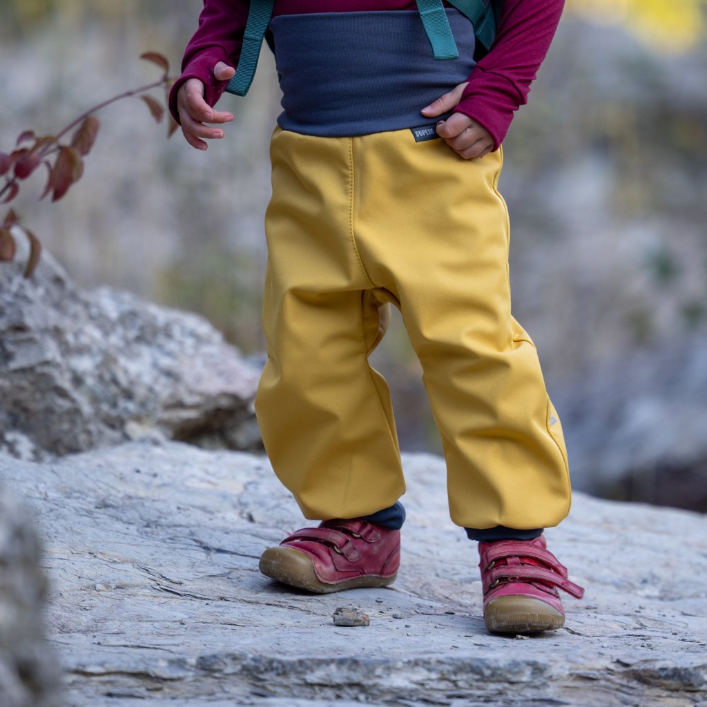 Softshellové nohavice pre batoľatá s fleecom horčicové