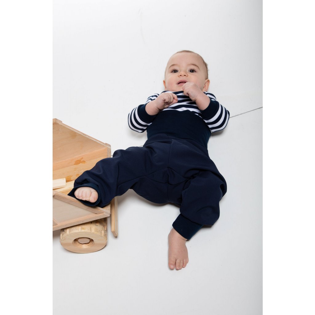- Kalhoty mají velkorysý sed. Bez problémů je oblečete i na látkovou plenku. (Navrhovaly a zkoušely jsme kalhoty s obzvláště vycpanou plenkou.)