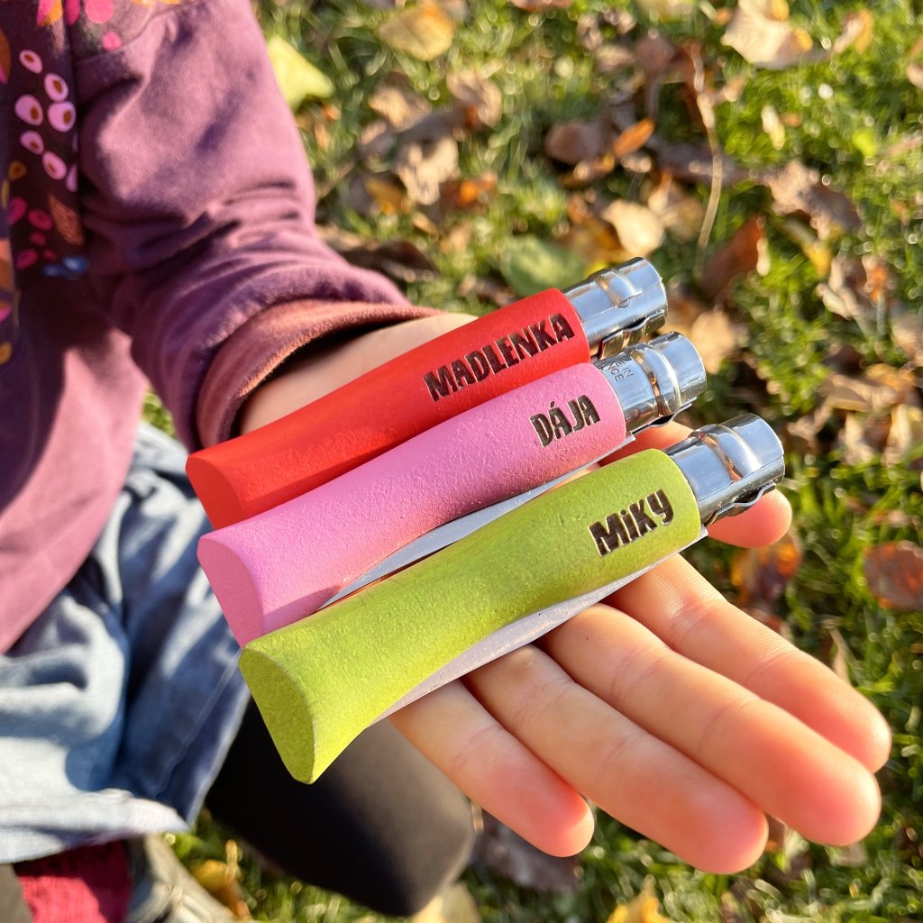 - Na nožík můžete dítěti nechat vygravírovat jméno nebo krátký vzkaz.